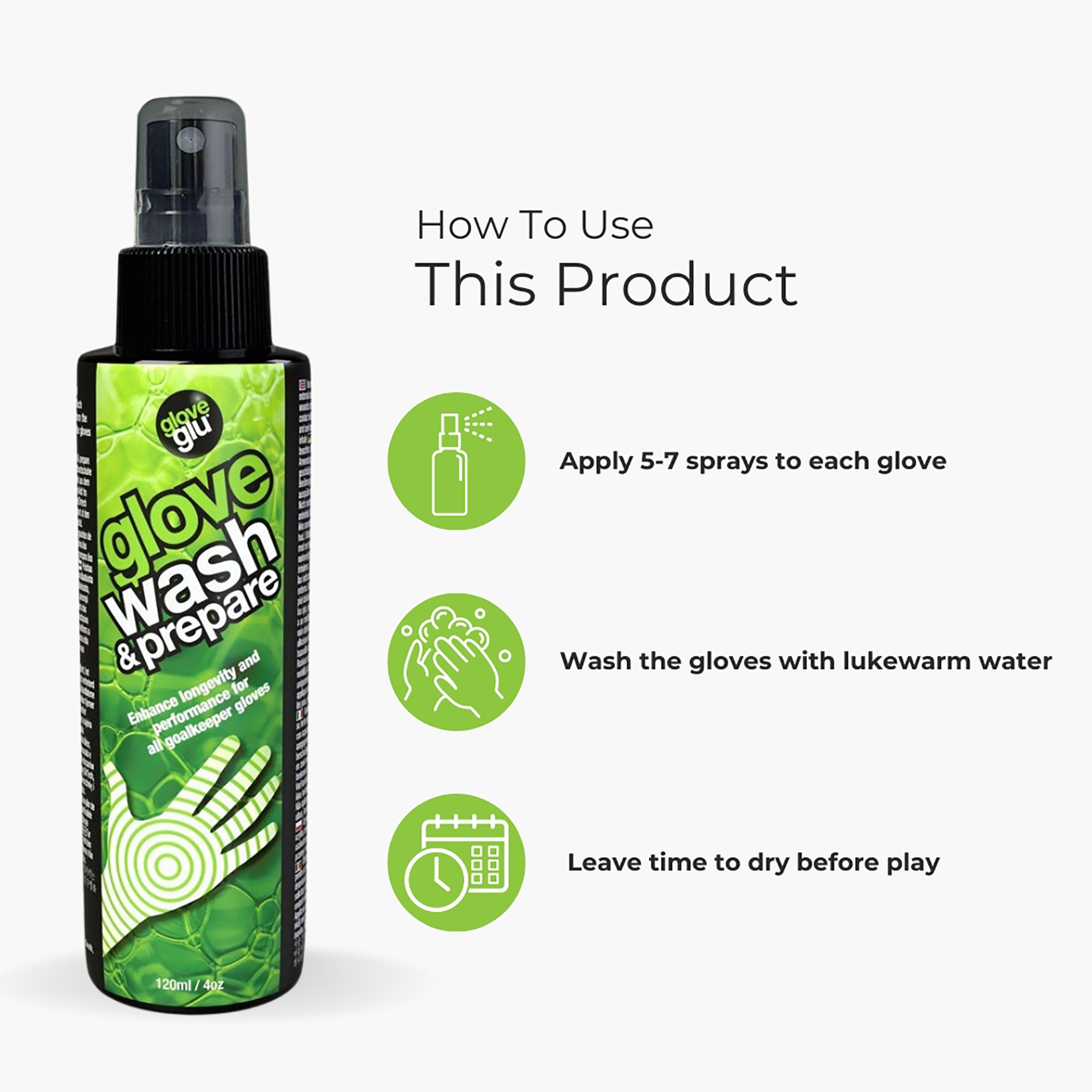 Spoel onmiddellijk na het spelen de handschoenenreiniger op de palm van elke handschoen (spuit 4 tot 6 keer).